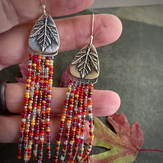 Maple leaf beaded fringe earrings are handmade from fine silver and 11/0 seed beads in fall color: crimson, amber, golds, with hints of purple. As the maple's leaves turn and fall from their branches, the tree transitions to a resting state by storing energy in their roots and trunk. As winter approaches, this transition can be peaceful and self-preserving. All living beings share this need for rest.