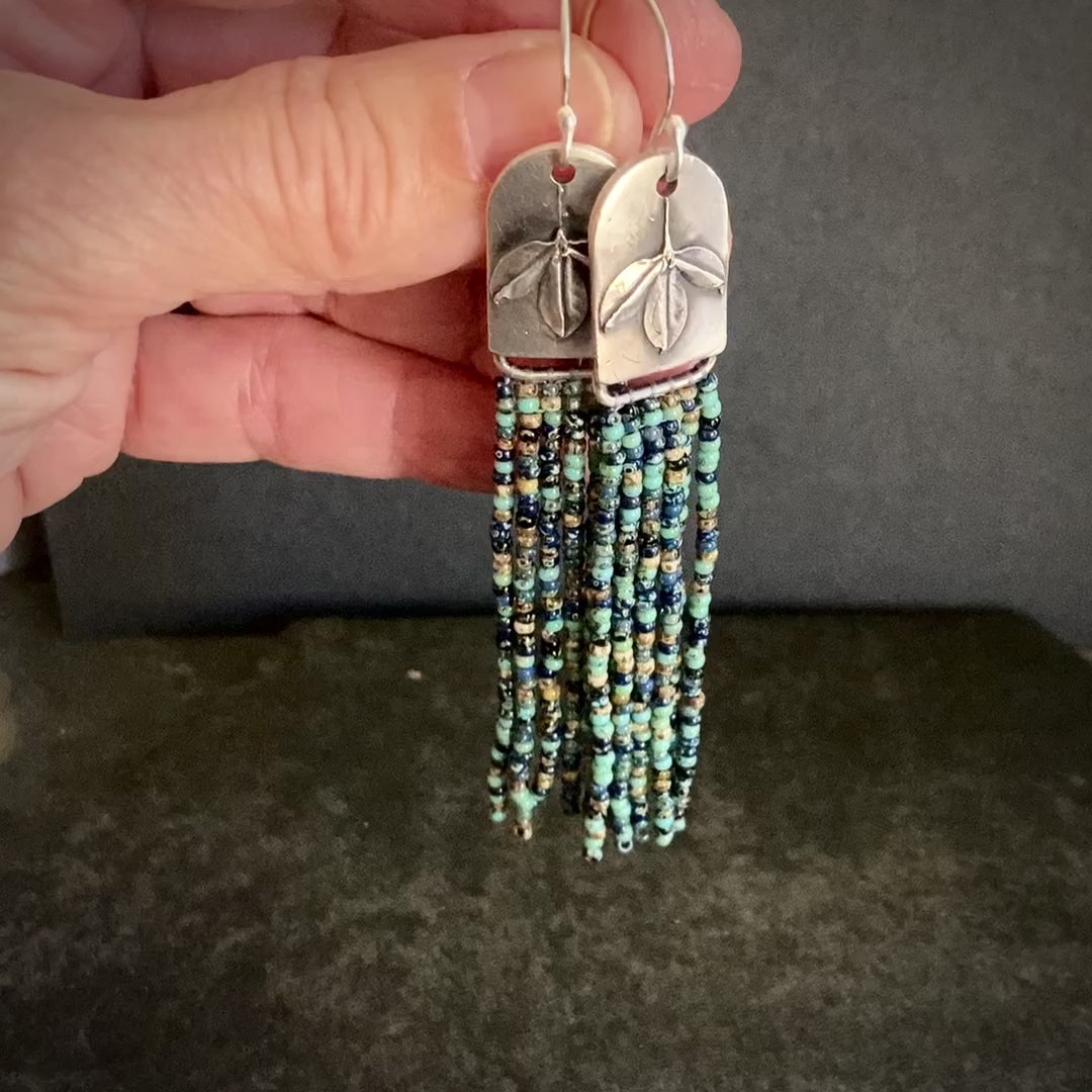It's just a leaf from a blue wild indigo or false indigo plant, but it represents so much more. These beaded fringe earrings were textured with a new leaf from a transplanted indigo plant, a gift from a friend. When the plant started to take root and produce new leaves, I pluck a small trifolate leaf from the new shoots as a reminder that life and friends are gifts.