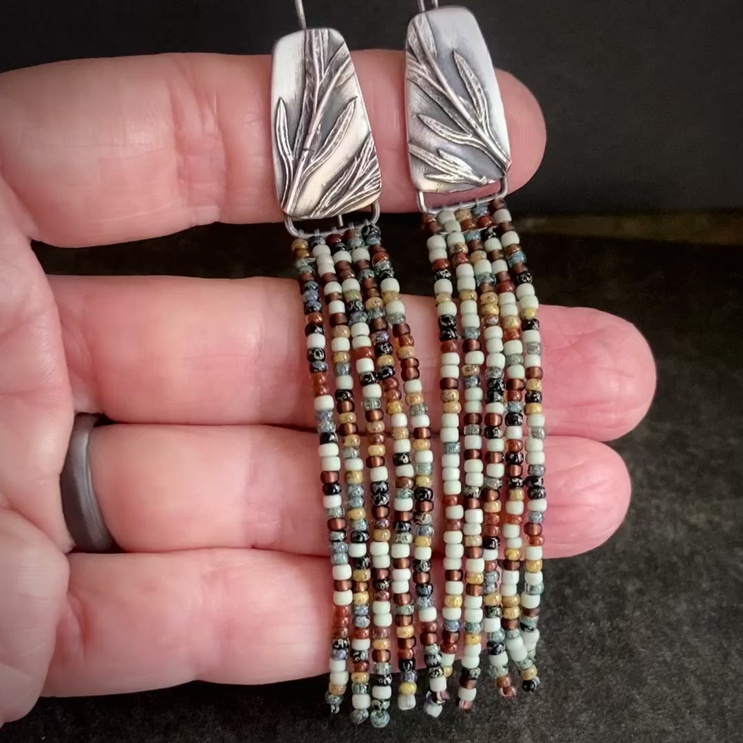 Sage green seed beads along with various browns, make these beaded fringe earrings with a prairie sage texture, the perfect earrings of earthy color. I created the textured portion from fine silver (99.9% silver), and it features asymmetrical impressions of prairie sage leaves. Sage is one of our Indigenous sacred plants.