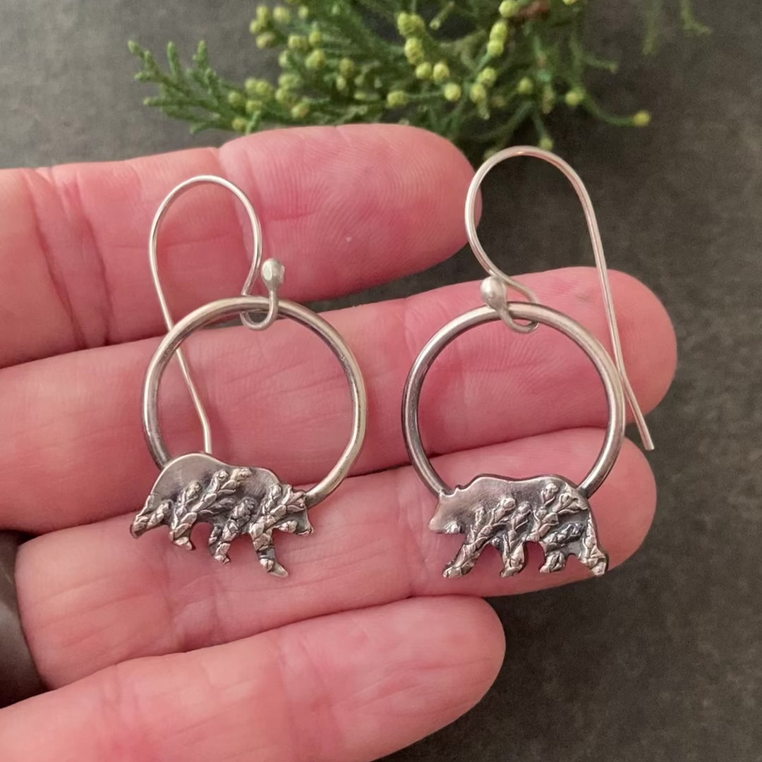 Bears are handmade from fine silver (99.9% silver) and soldered to sterling silver (92.5% silver) hoops. Ear wires are forged from sterling silver.