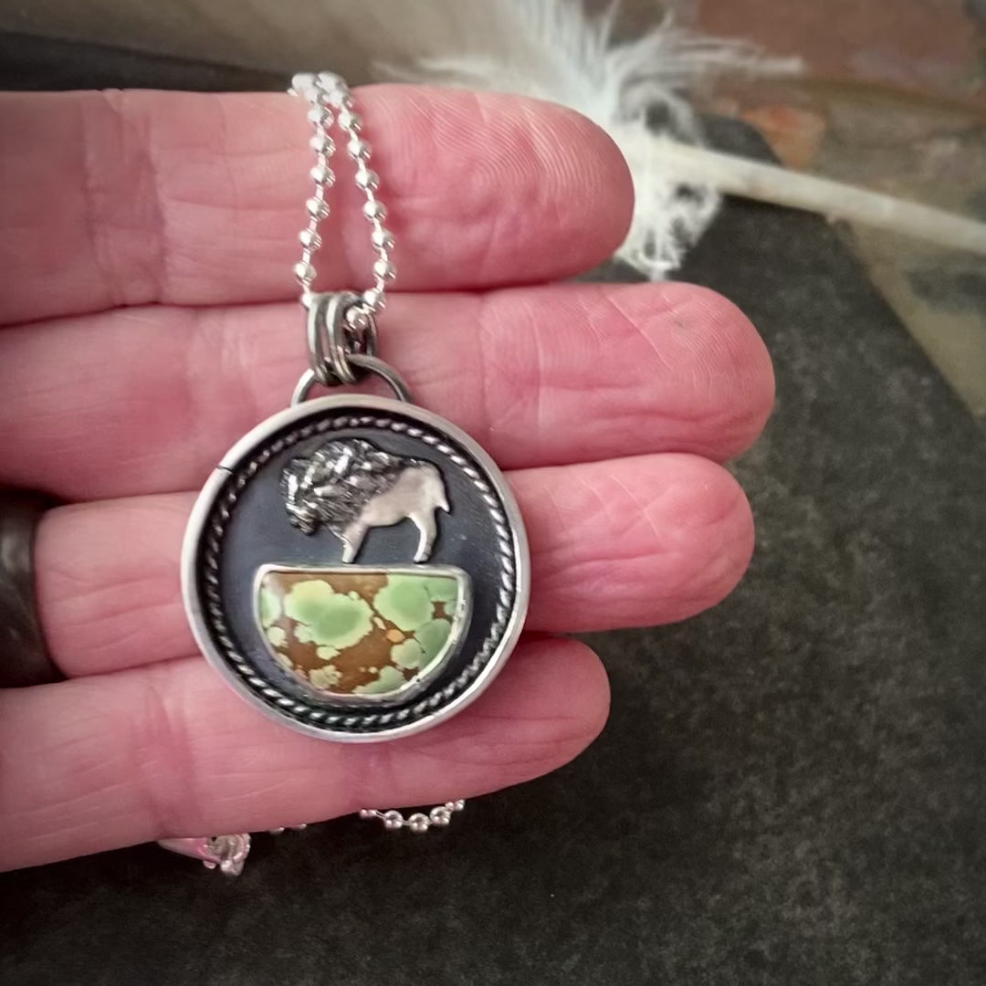 I created the bison in fine silver (99.9% pure silver). Everything else is sterling silver (92.5% silver) including the chain. Stone is bamboo mountain turquoise.