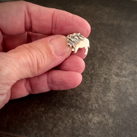 Each bison silhouette is created from fine silver (99.9% silver) and is soldered to a nickel tack. The clutch is made from brass with a nickel finish.