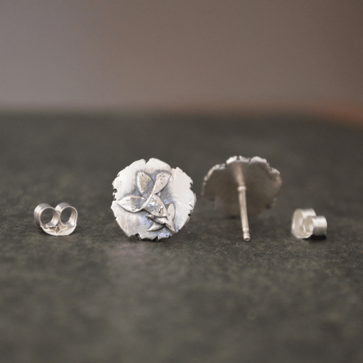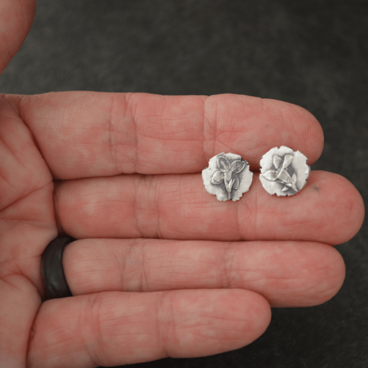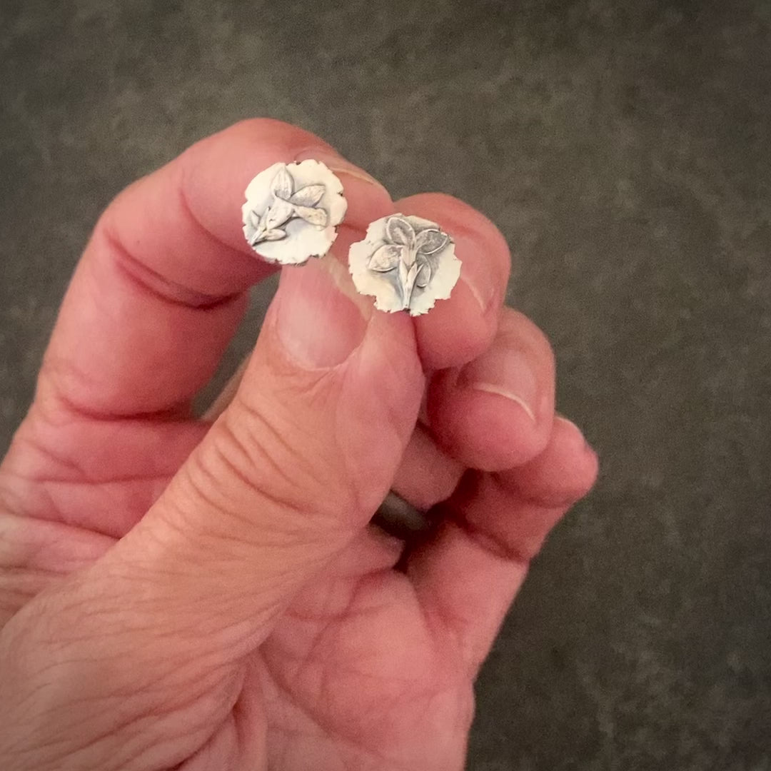 Fine silver stud earrings are molded from two different small bluet flowers. Her tiny blooms can easily be overlooked in spring, making her feel somewhat invisible. These rustic stud earrings are part of my prairie jewelry collection. They are oxidized to bring out the texture.