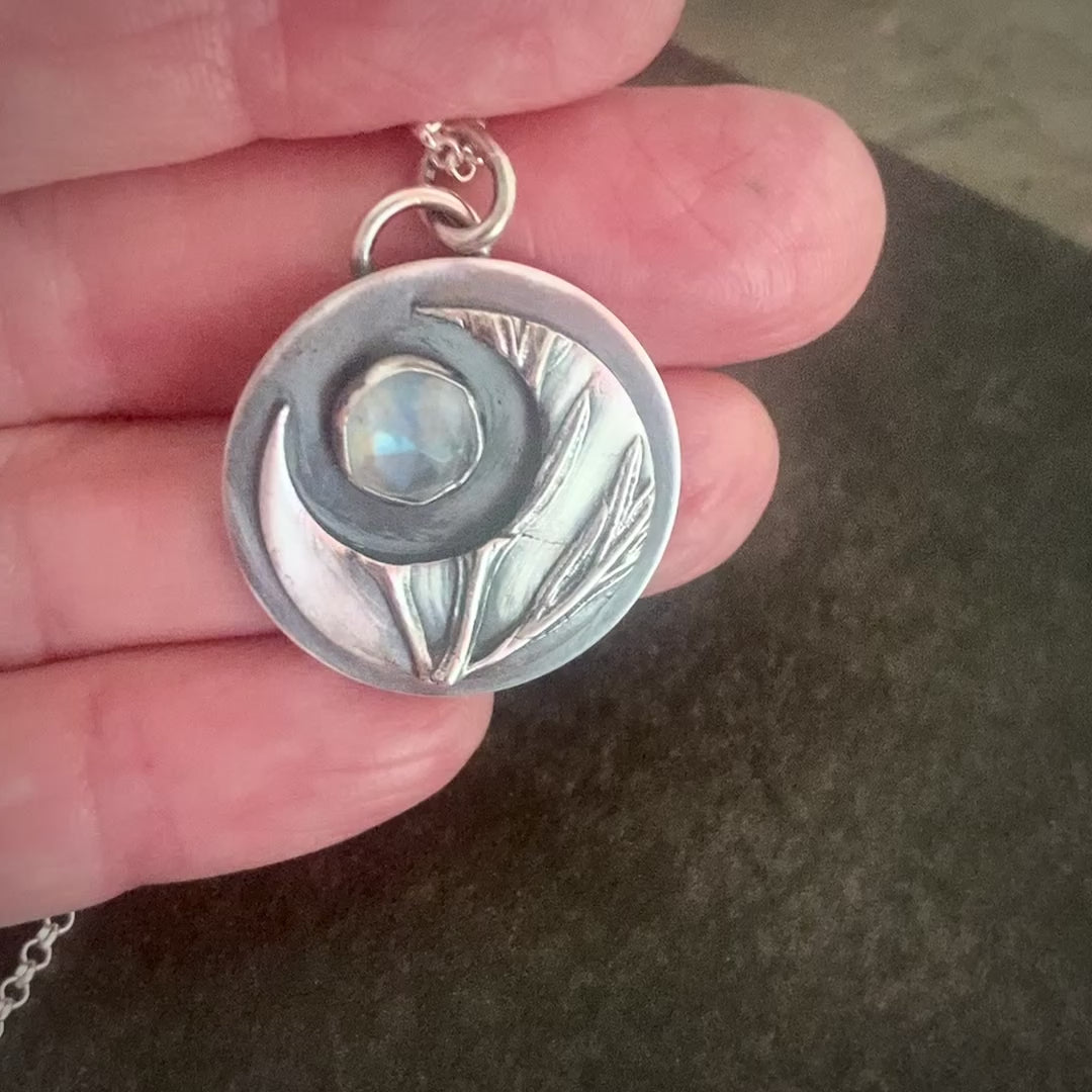 There is a little bit of lunar magic that emanates from this crescent moon necklace. The moon holds a blue rainbow moonstone that is like a luminous moonbeam. The white sage that textures this piece keeps the moon dancing but still connected to the earth as a source of light on our night prairies.