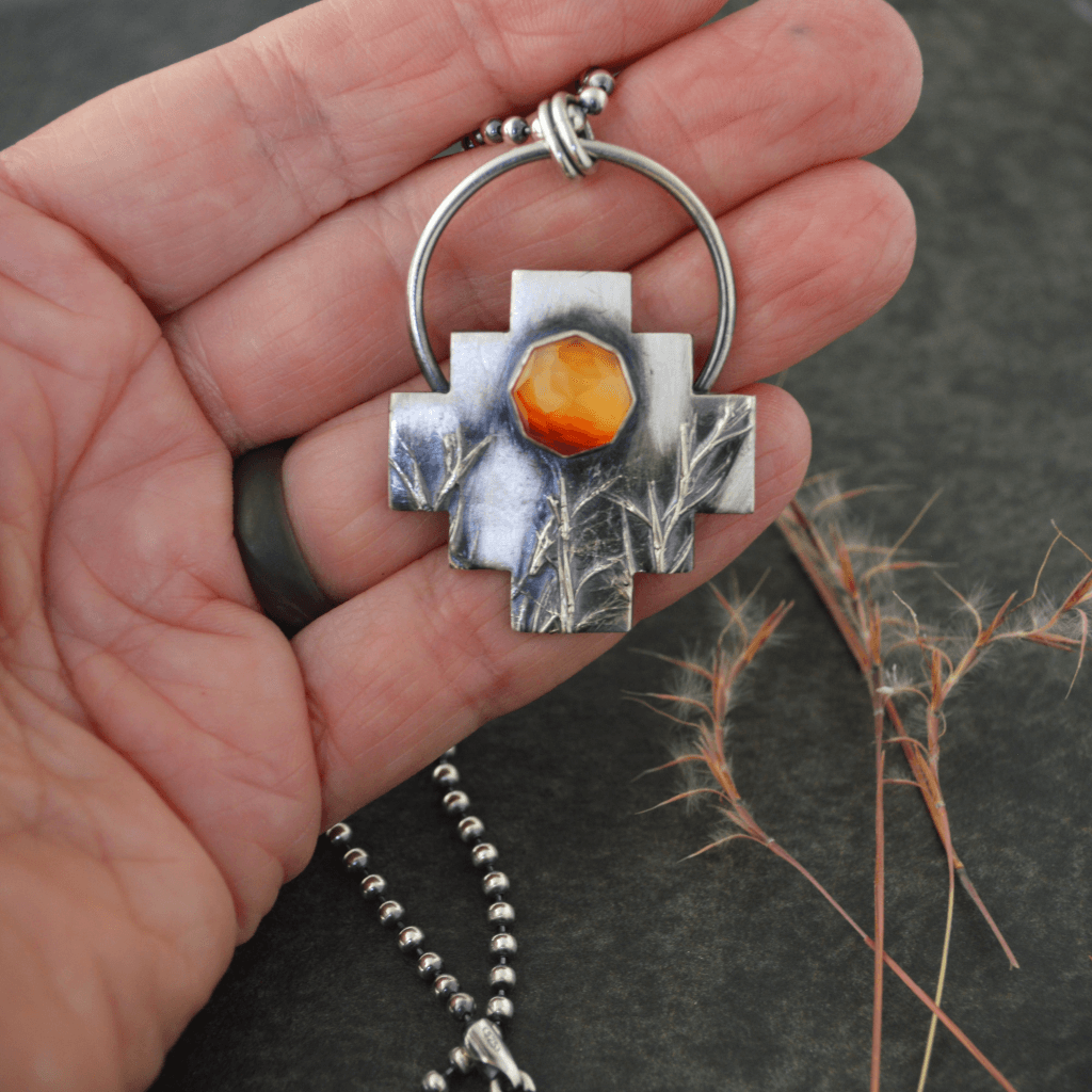 The setting sun can be seen on the horizon of the prairie as it dips down to kiss the earth at its edge. A carnelian agate gemstone that has a graduated coloring like the setting sun is the highlight of this piece. The sun is still above the tips of the little bluestem that frames the setting sun as if to bid it "good night".