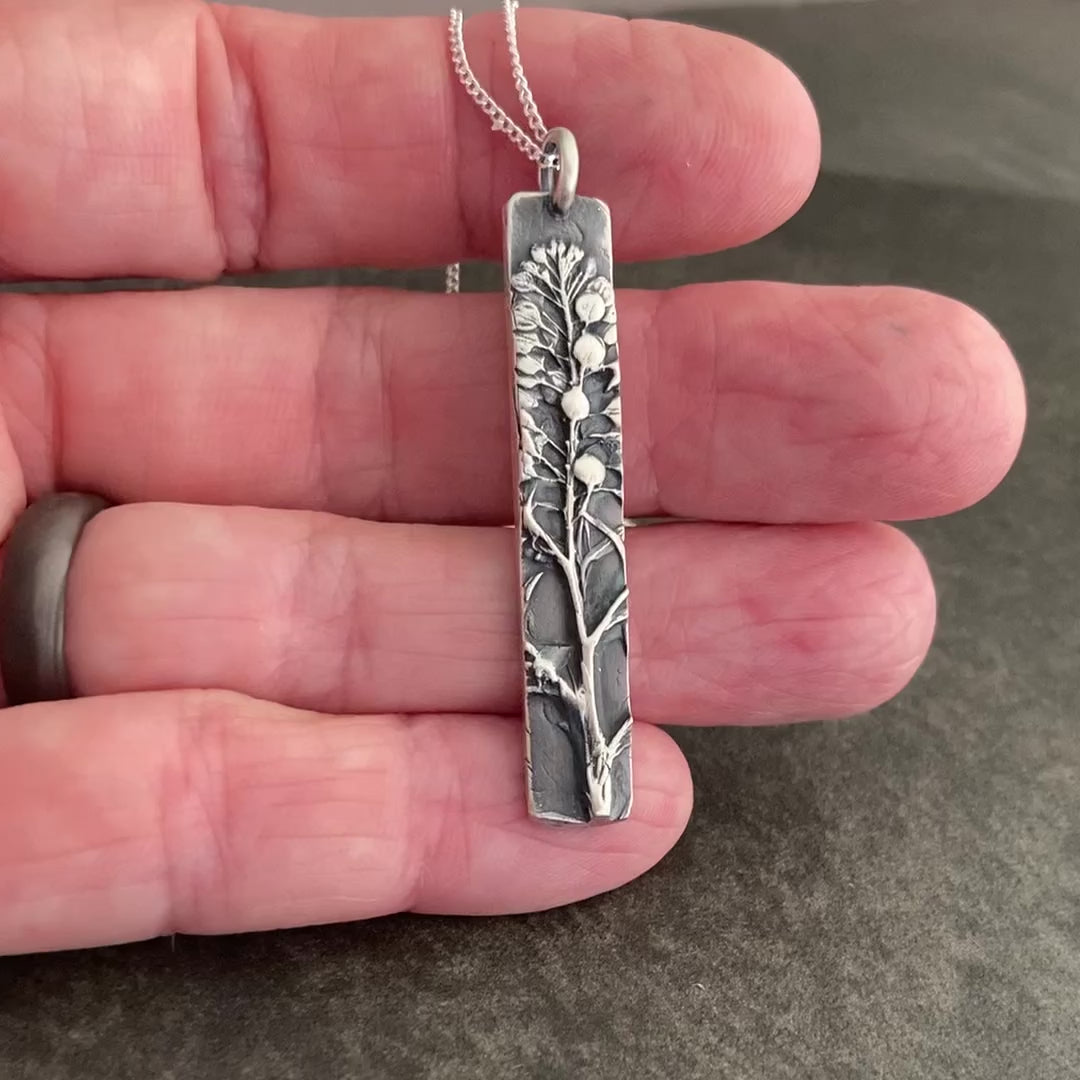 I've admired the texture peppergrass gives to my jewelry pieces. It's such a unique texture. I love these longer pendants that highlight the height of the grasses. I've oxidized the pendant to bring out the wonderful texture of the grass and then polished the raised portions to a high shine.