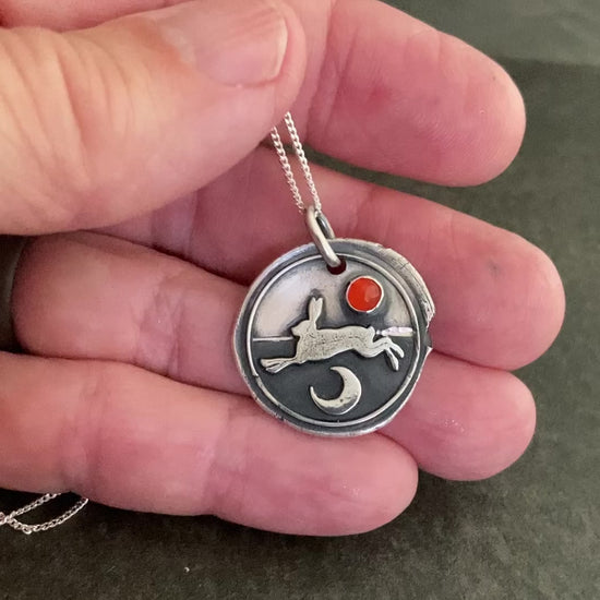 We count rabbits by the lake as we walk in the warmer seasons. Because of the abundant habitat in this area, there are multiple bunnies in the few miles we walk. This fine silver pendant necklace represents those moments out in nature. The transition between day and night, the setting sun and the rising moon, is the time when the rabbits come out to play.