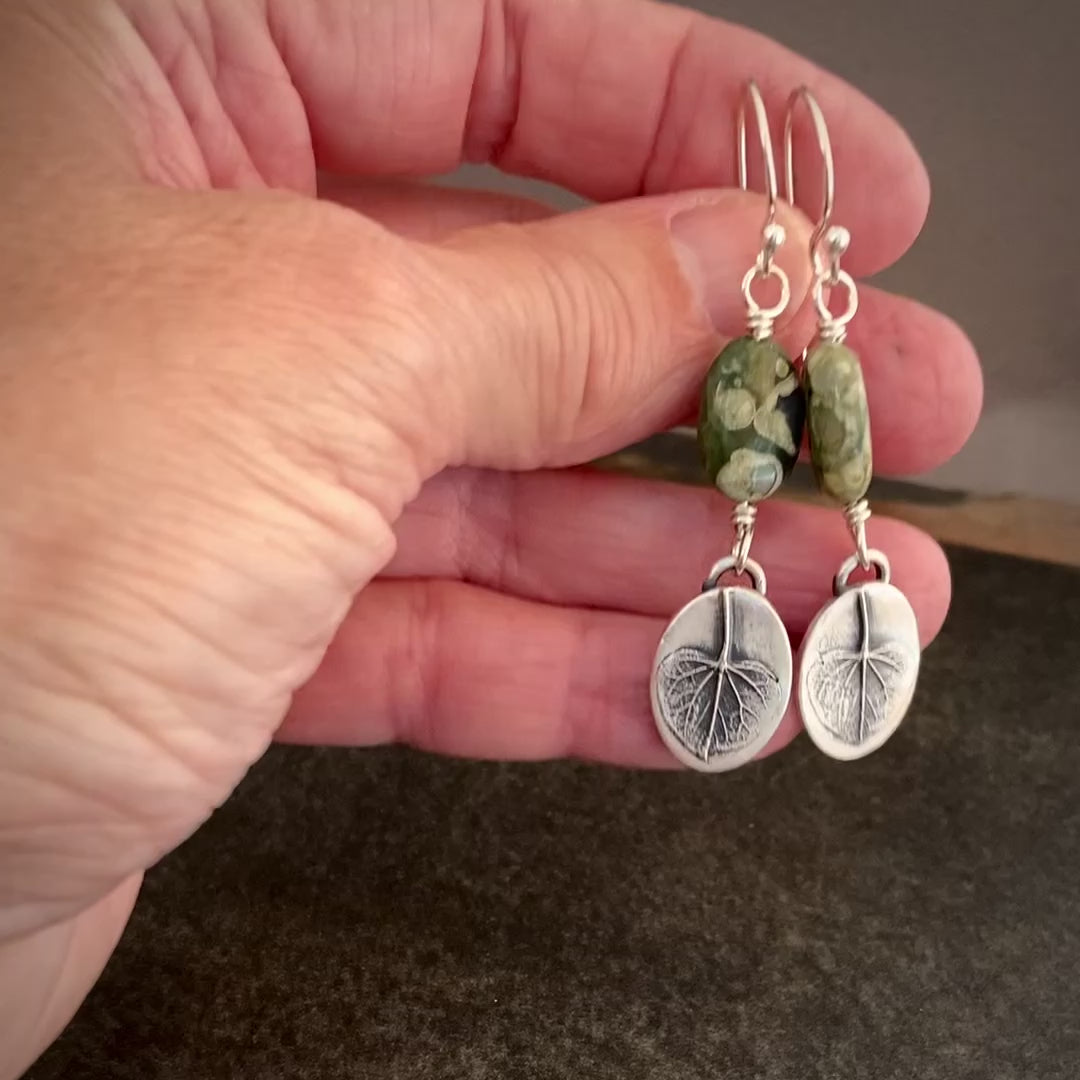 Redbud leaf earrings are created in fine silver and paired with green rhyolite stone beads. Redbud trees are abundant in Kansas with their heart-shaped leaves and purple-pink flowers in early spring. It is such a lovely tree.