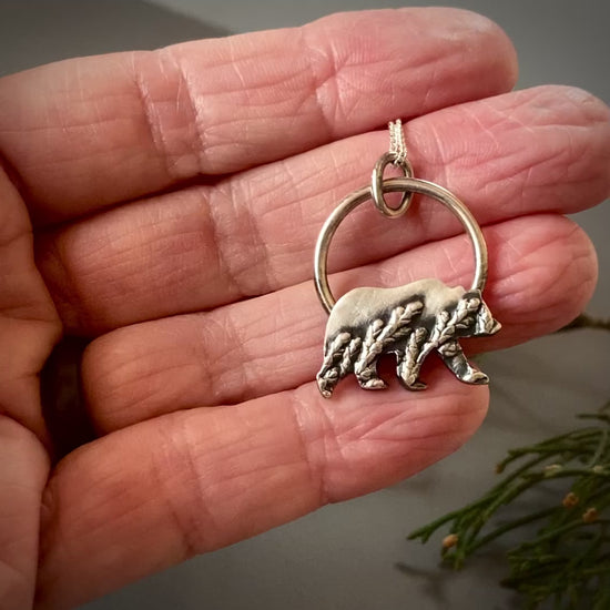 Silver Bear Pendant Necklace Textured with Cedar