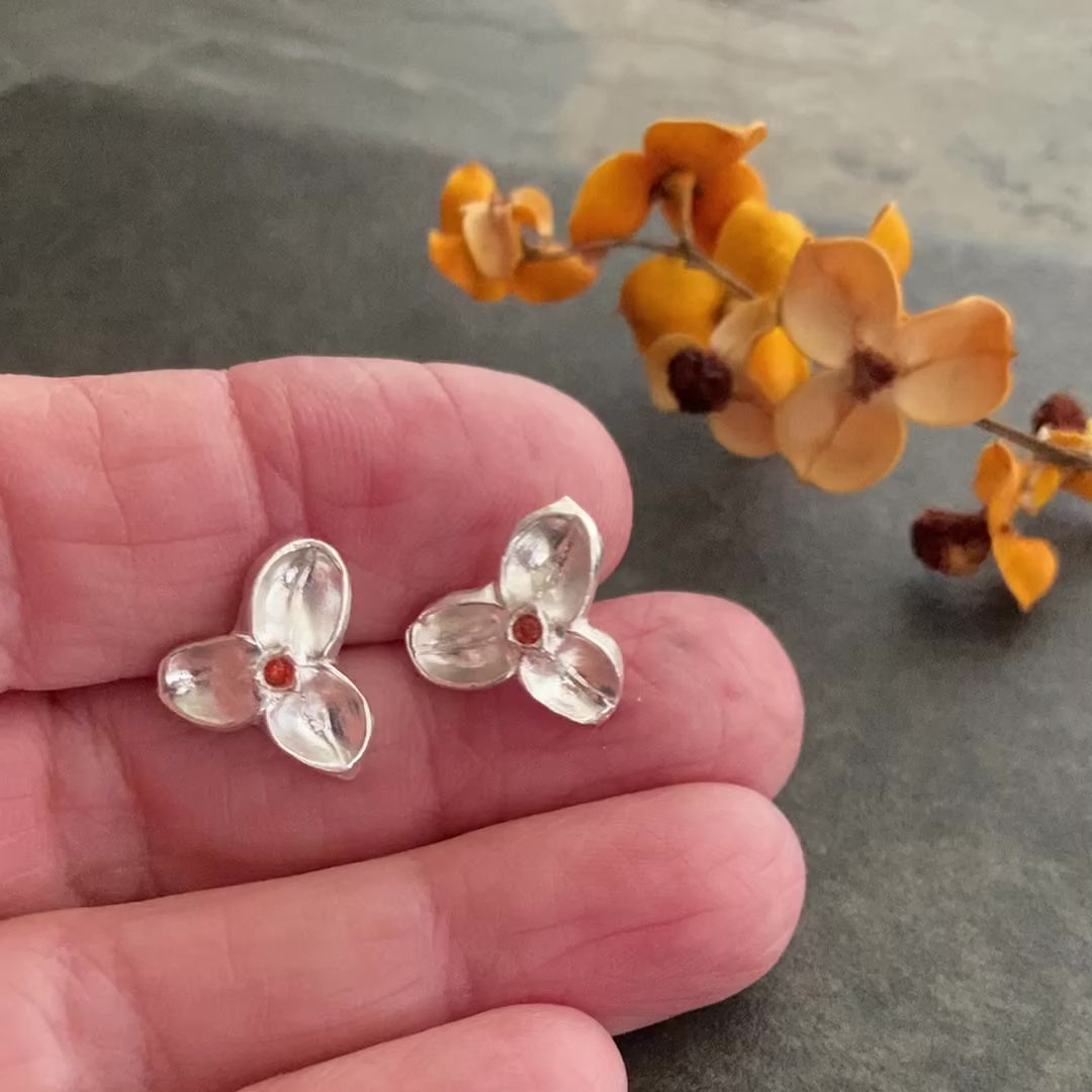 Bittersweet pod stud earrings were created in fine silver and I added a 2mm orange cubic zirconia stone to each center. American bittersweet shows its most beautiful orange color in the middle of winter in time to attract the birds with its bright red berries. These shiny bright silver earrings are a nice size for everyday wear.