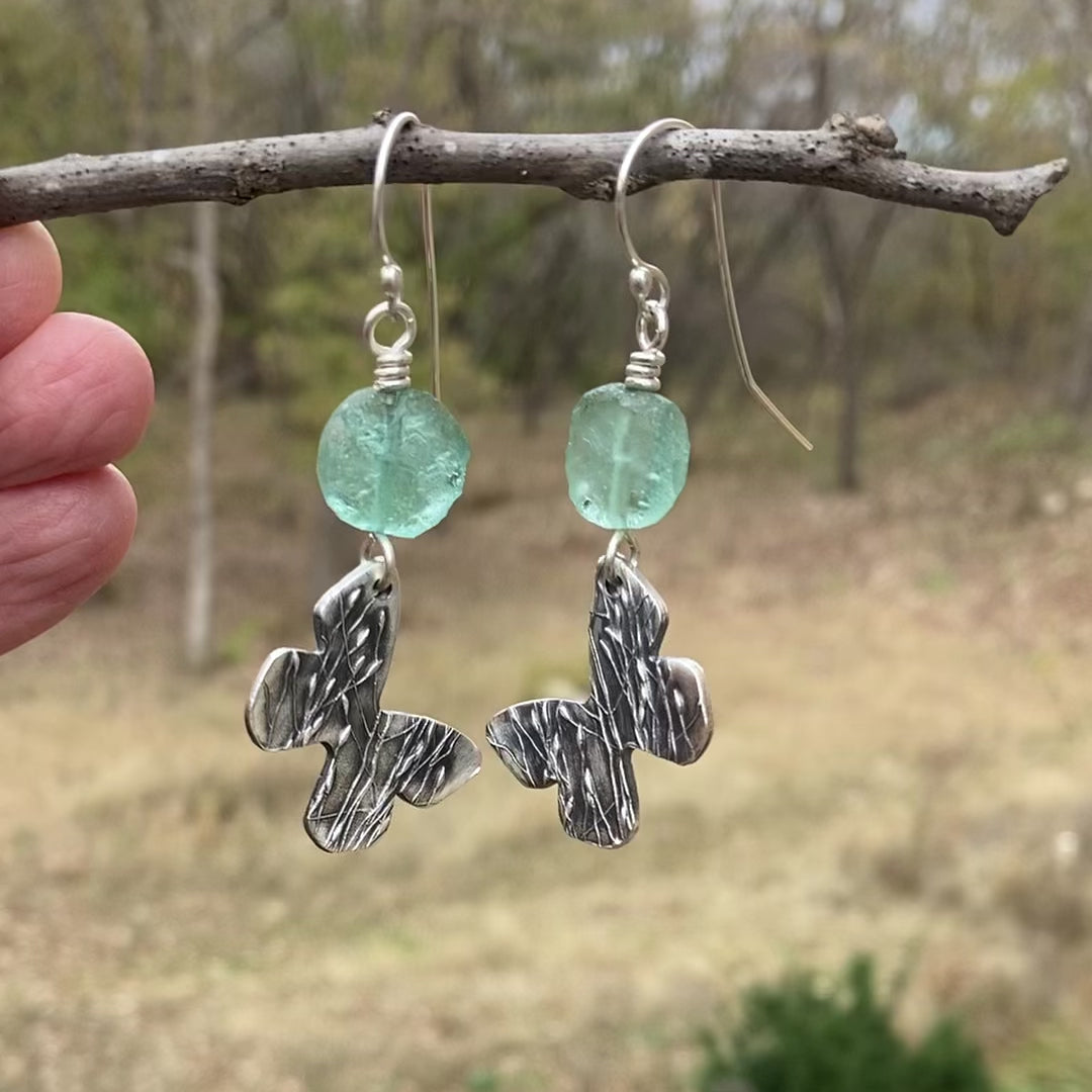 Silver butterfly earrings are textured with prairie ticklegrass. Each butterfly dangles from my hand-forged fish hook ear wires of sterling silver. Each earring is topped with a bead recycled from blue-green ancient Roman glass. Beads have a lot of chips and pits, making them rustic and a great compliment to our rustic grasses.