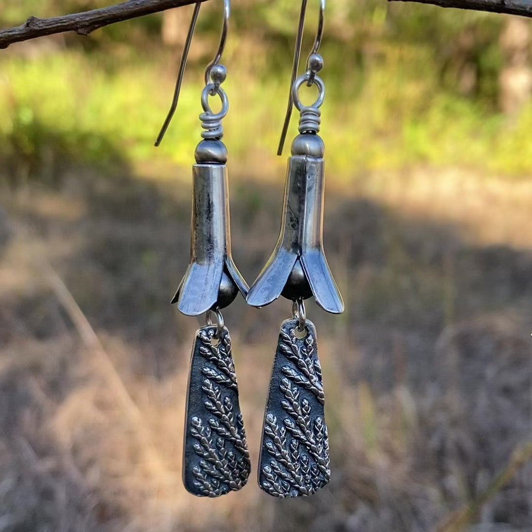 I created these beautiful southwest-style earrings using cedar for texture. These silver squash blossom earrings will be a great addition to your ribbon skirt or western wardrobe. I've oxidized the earrings to bring out the beautiful texture of the cedar.