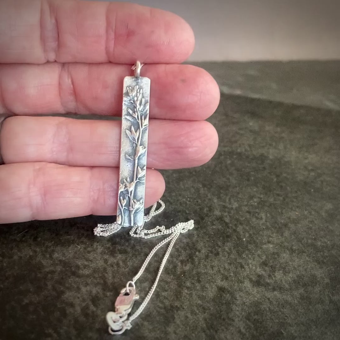 The speedwell plant often goes unnoticed in the spring, but if you look closely, you can see the beautiful, tiny blue flowers. I textured this fine silver pendant with a stem of speedwell. Pendant hangs from your choice of chain, 18" or 20".