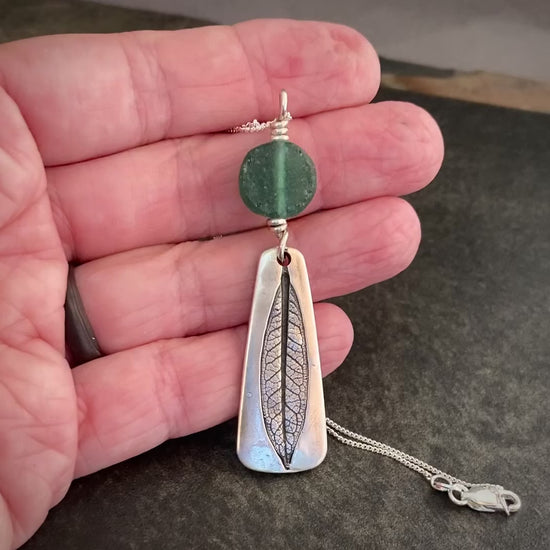 I captured a beautiful swamp milkweed leaf in this long triangular pendant of sterling silver. The detail on the veining is enhanced with a dark patina in the recesses. I created this with a satin finish so that the leaf impression really stands out. I've wire-wrapped a blue-green ancient Roman glass bead at the top.