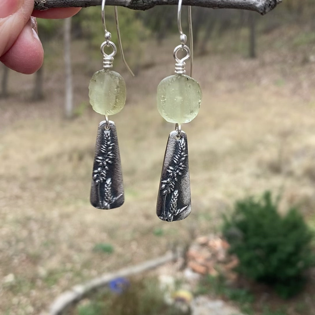 Long drop earrings are textured with yellow sweet clover. Each fine silver drop dangles from my hand-forged ear wires of sterling silver. Each earring is topped with a bead recycled from yellow-brown ancient Roman glass. Beads have a lot of chips and pits, making them rustic and a great compliment to our rustic ancient plants.